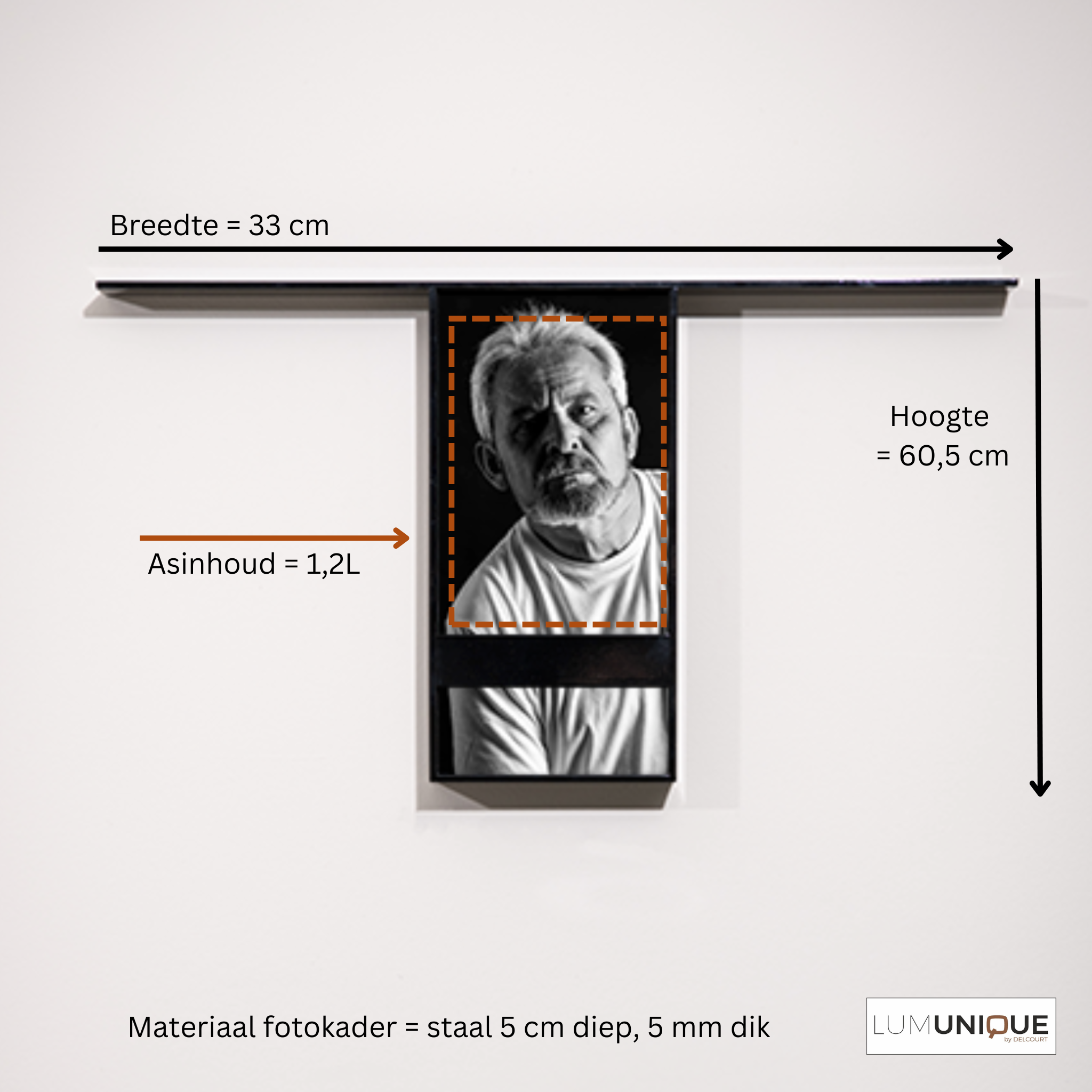 Onze urne ziet eruit als een elegante fotokader, maar bevat achter de foto een discrete ruimte voor de assen van je dierbare. Die worden veilig opgeborgen in een verborgen compartiment aan de achterzijde, afgesloten met een stijlvol metalen plaatje en vier vijzen.