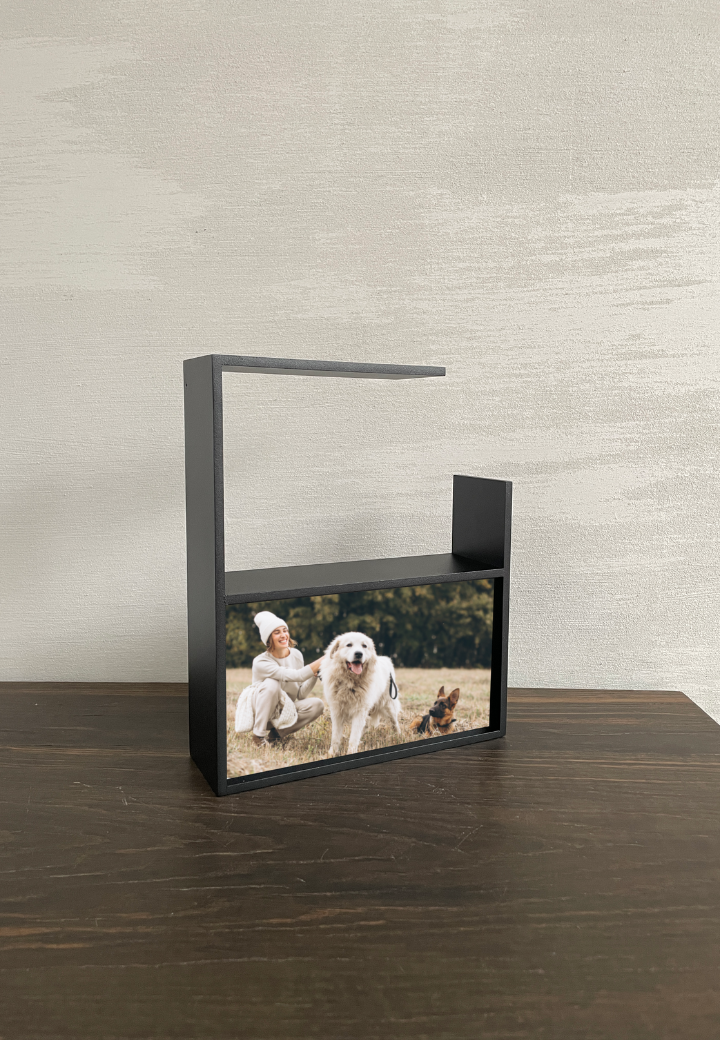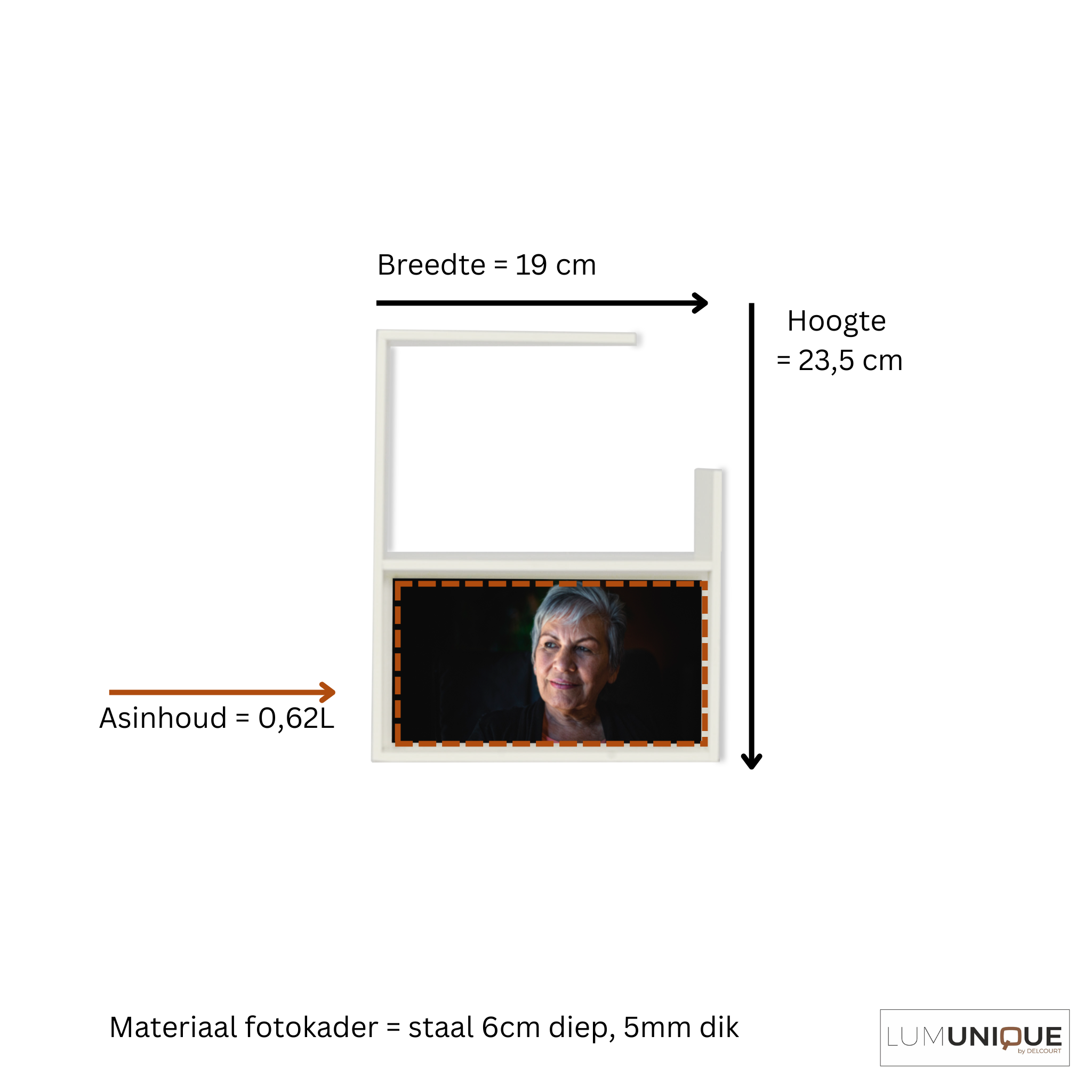 Onze urne ziet eruit als een elegante fotokader, maar bevat achter de foto een discrete ruimte voor de assen van je dierbare. Die worden veilig opgeborgen in een verborgen compartiment aan de achterzijde, afgesloten met een stijlvol metalen plaatje en vier vijzen.